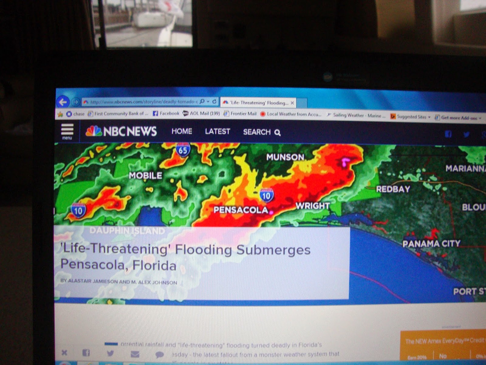 Monday was primarily windy with a few showers late in the day. After midnight all hell broke loose. High winds, Non-stop rain, and endless lightning. At times being on Tourist was like being a contestant in a rodeo. The severe weather lasted all Tuesday and into Wednesday morning. In all they reported over 2 feet of rain had fallen causing flash flooding all over the area. 5" fell between 9 and 10 pm Tuesday alone. Supposedly this was more rainfall than in all of hurricane Ivan. Over 44,000 lightning strikes were recorded in one hour on Tuesday. And we lost power at the marina for nearly 20 hours. Unfortunately one woman lost her life due to the flooding.